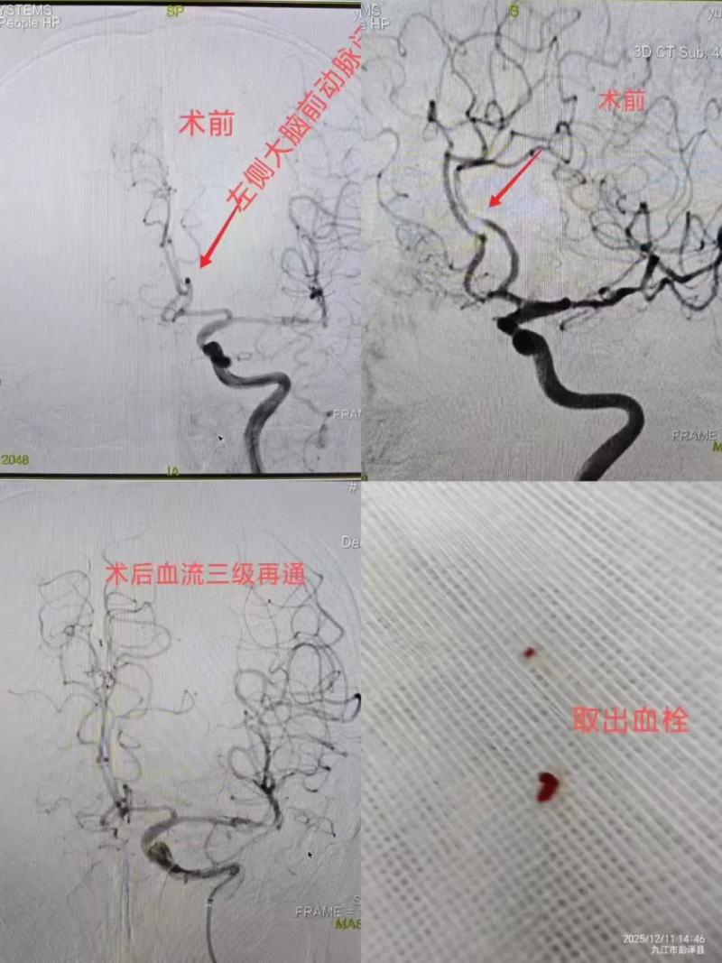在医院麻醉科、介入室、内一科团队的紧密配合下,患者被迅速送入介入室。由于患者血管有变异,且迂曲,考虑在大脑前动脉病变,需要在全身麻醉下,由经验丰富的内一科团队施行“全脑血管造影术+血管内取栓术”。凭借精湛的技术,成功将堵塞血管的血栓取出,恢复了大脑前动脉的血流。手术取得了立竿见影的效果,术后,患者生命体征平稳,很快从麻醉中苏醒。